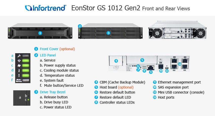 Designed to support hybrid environments that integrate SAN, NAS, and cloud services, this platform can be integrated with enterprise businesses of all sizes to address various applications. Outfitted with a single controller or dual redundant controllers, the entry-level Infortrend EonStor GS 1012 Gen2 Storage appliance is outfitted with a single Intel Atom processor with up to 4x physical cores and 4x virtual threads. The single controller has a default cache memory configuration of 8GB of DDR3 memory which can be upgraded to 16GB. With the dual controller configuration, the cache memory capacity is 16GB by default, which can be upgraded to 32GB. Due to the hardware configuration of this high-availability storage enclosure, the thermal design point (TDP) of the CPU is limited to 38W. The front of the server houses up to 12x 3.5-inch drive bays compatible with 2.5-inch and 3.5-inch SAS or SATA SSDs or HDDs, in addition to U.2 NVMe SSDs, which may require additional parts.