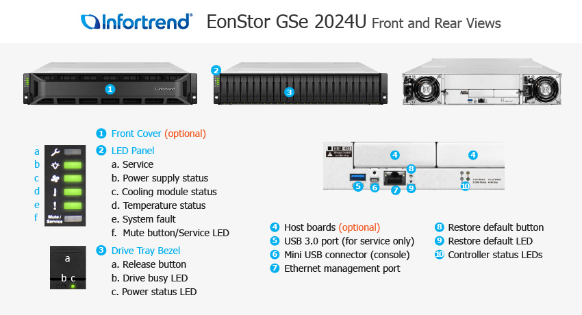 With scale-out via other Infortrend series appliances, the Infortrend EonStor GSe 2024U can support up to 3,584 drives maximum. The single controller features a single Intel Xeon D 2-core CPU with 8GB of cache memory by default and the option to increase to 64GB. The controller also has a supercapacitor and flash module to ensure data is still saved in the event of a power failure. There is a single Ethernet management port and 2x slots for installing optional host boards which will provide a variety of host ports and link connections depending on your choice. Host board options include 2x ports for connecting expansion enclosures and 2-4 ports for connecting host systems. For Remote Direct Memory Access or RDMA you will need host boards with 25Gb/s SFP28 with either 2x ports or 4x ports.