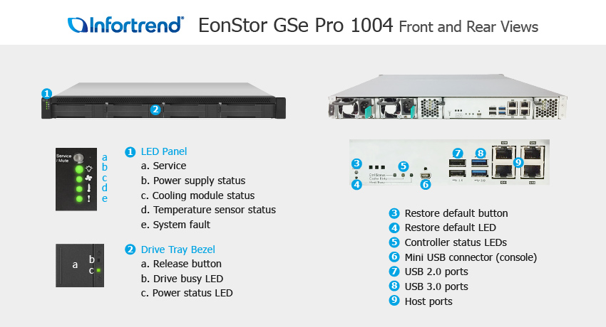 Designed for small to medium-sized businesses, the controller is powered by an Intel Atom 4-core processor with up to 16GB of DDR3 cache memory. The Infortrend GSe Pro 1004 storage appliance controller supports 4x onboard 1GbE host ports (RJ45) on the rear of the chassis. Depending on the model, the GSe Pro 1004 offers either 1x 250W hot-swappable PSU or 2x 250W hot-swappable PSUs.